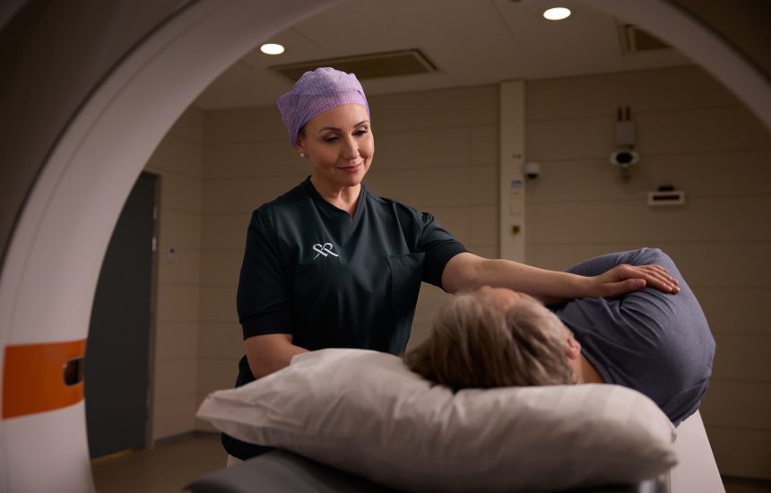 – Vid spridningsundersökningar använder vi radioaktivt märkta markörer som mycket lätt identifierar och lokaliserar cancerceller och metastaser. Den markör som lämpar sig för prostatacancer och som ges till patienten vid en PET-DT-undersökning söker sig till cancercellernas ytstrukturer eller till exempel till skelettmetastaser som har en ökad ämnesomsättning. Vid avbildningen kan man sedan med hjälp av den radioaktiva strålningen se var metastaserna finns.